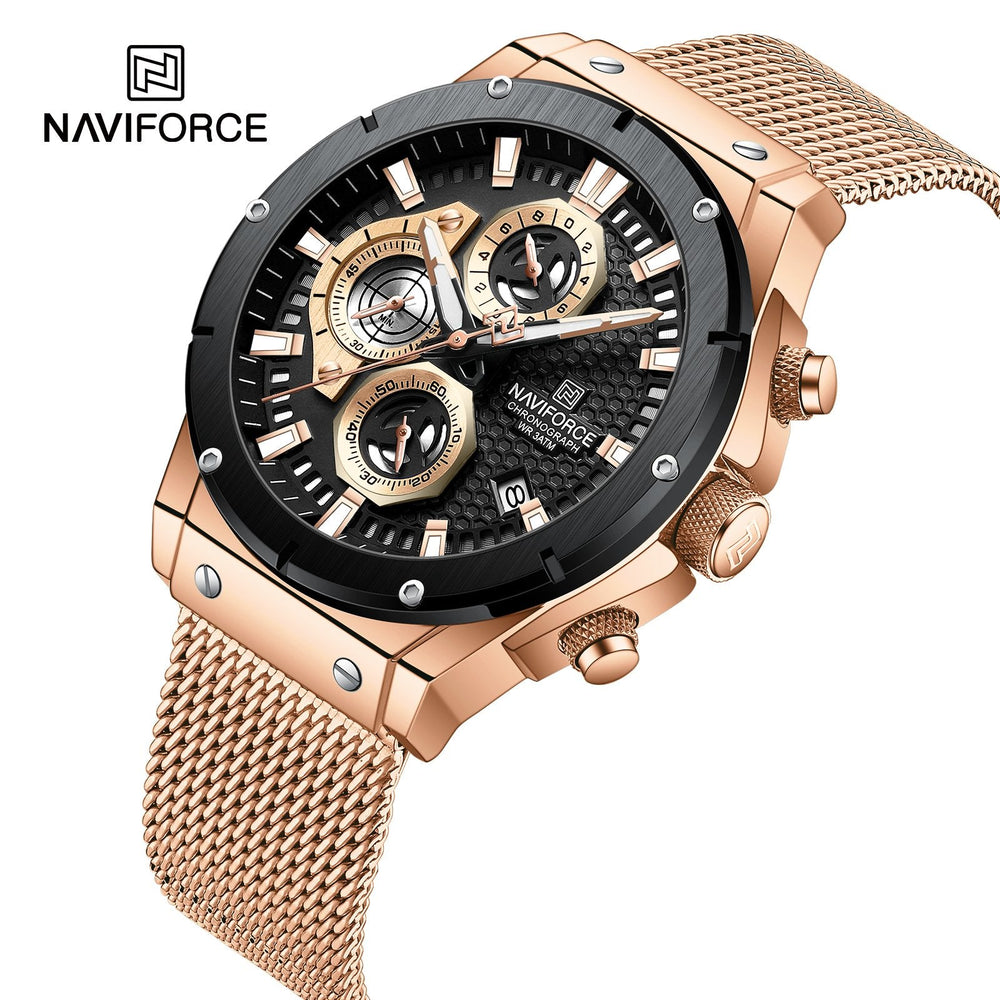 Naviforce Chronograph Men’s Watch Delivered All Over Pakistan iShopping.pk brings you the best price for Naviforce Chronograph Men’s Watch Golden (NF-8027-4) with express shipping all over Pakistan. Details: • Environmental Vacuum ion plating • Hardened Mineral glass • 3ATM waterproof • Zinc alloy case • Stainless Steel Strap • Luminous hand